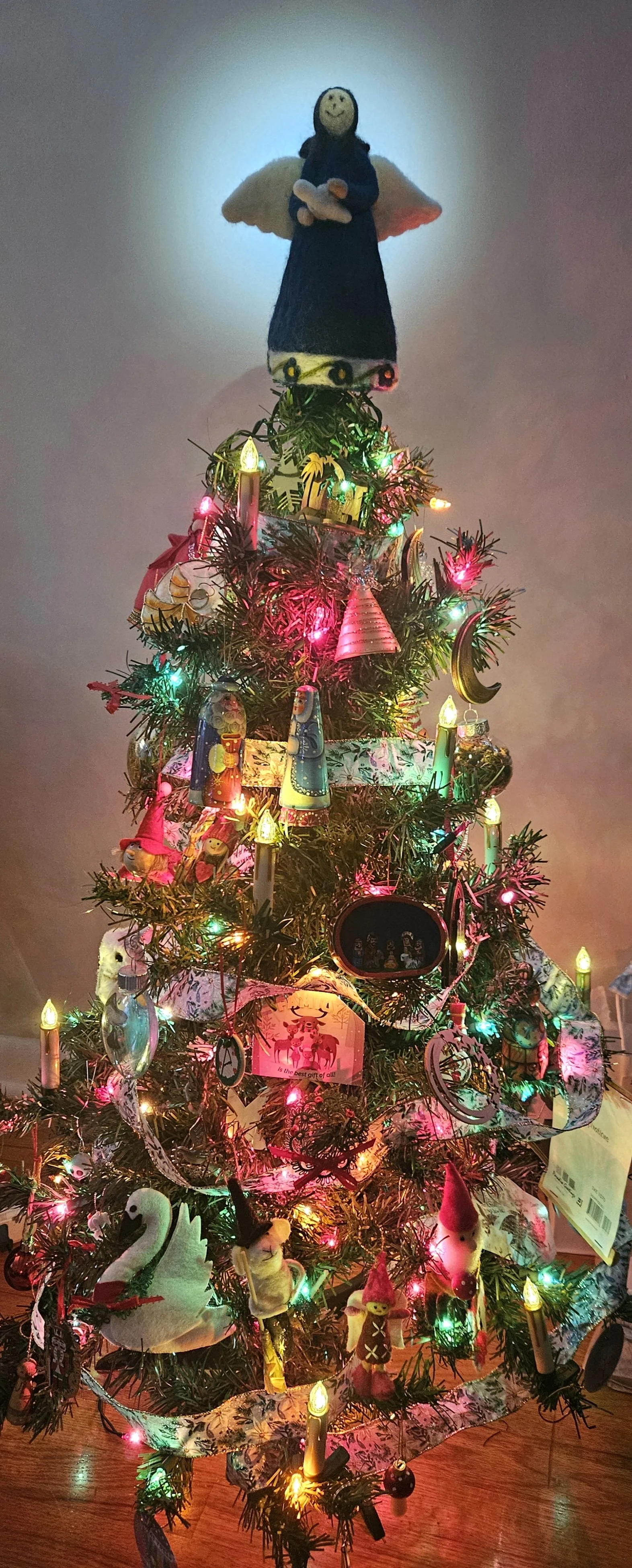 Brightly glowing, the tree stands as centerpiece to a vast kingdom all of my own creation. From every branch and bower, memories peek out in wonder. This one to commemorate a move to a new home, that one from a dear friend, and those to remember loved ones now long gone but still within my heart. Baubles and cards, fairies and elves, snowflakes and angels, and a whole menagerie of stuffed creatures spread out their smiles as artificial candles made real burn calmly, recalling Yuletide festivities of Christmases past. Floating above, a blue-clad angel is guardian, as the dove that sits quietly in her arms exudes the peace and holy silence that surrounds this season.